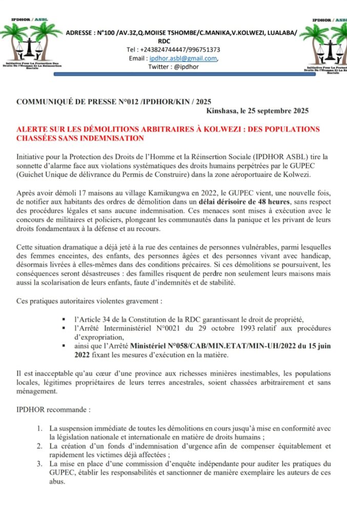 IPDHOR insiste « qu’il est inacceptable qu’au coeur d’une province aux richesses minières inestimables, les populations locales, légitimes propriétaires de leurs terres ancestrales soient chassées arbitrairement et sans ménagement».