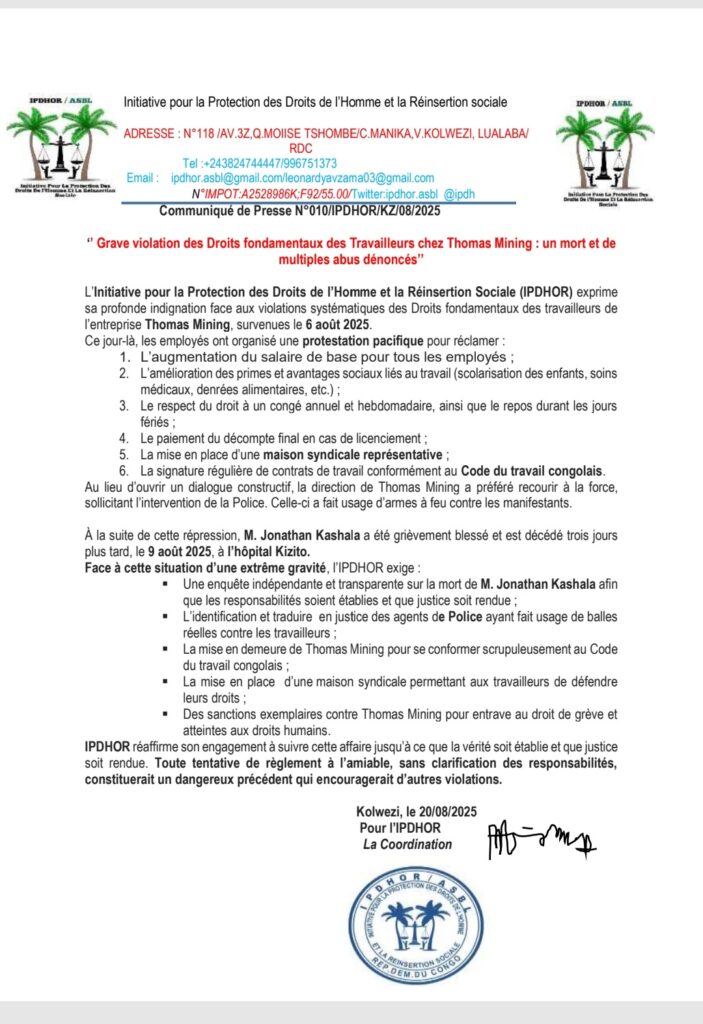 Dans un communiqué publié, ce mercredi 20 août 2025, IPDHOR condamne fermement la répression de la marche pacifique organisée par les travailleurs de l’entreprise THOMAS MINING, conduisant à un mort. “Au lieu d’ouvrir un dialogue constructif, la direction de Thomas Mining a préféré recourir à la force, sollicitant l’intervention de la Police. Celle-ci a fait usage d’armes à feu contre les manifestants. À la suite de cette répression, M. Jonathan Kashala a été grièvement blessé et est décédé trois jours plus tard, le 9 août 2025, à l’hôpital Kizito” Peut-on lire dans ce communiqué.
