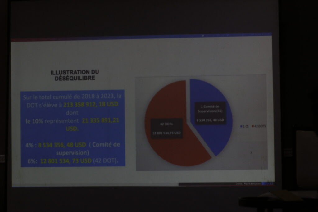 Le fonds de la dotation de 0,3 % du chiffre d’affaire est réparti entre 3 organes. Le comité de supervision , l’Organisme Spécialisé et l’Unité d’Exécution de Projet. Selon cette étude, c’est le Comité de Supervision avec 4 % sur toutes les dot déjà installées, se tape la part du Lion. L’écart est considérable !